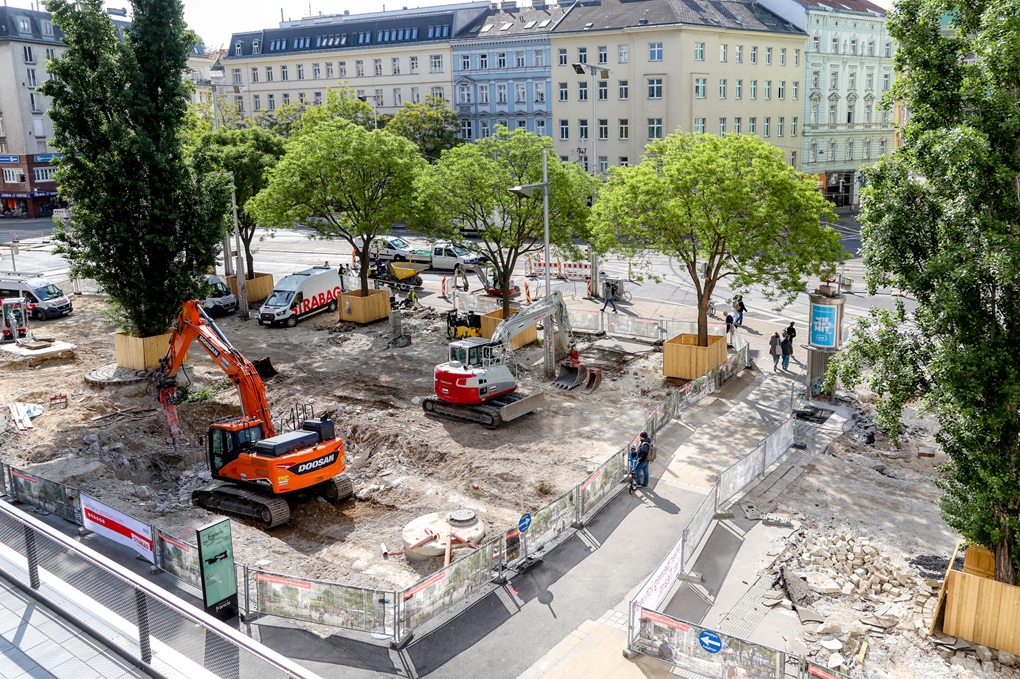 Radovi na većem dijelu 8000 m² površine trga već su u završnoj fazi, a aktualnoj „zelenoj“ zagrebačkoj vlasti najbolje demonstriraju kako izgleda stvarna izgradnja klimatske otpornosti. Pod poznatim bečkim motom „Raus aus dem Asphalt!“, asfalt se uklanja i s ovog bečkog javnog prostora, a tlo se doslovno oslobađa i vraća prirodi.