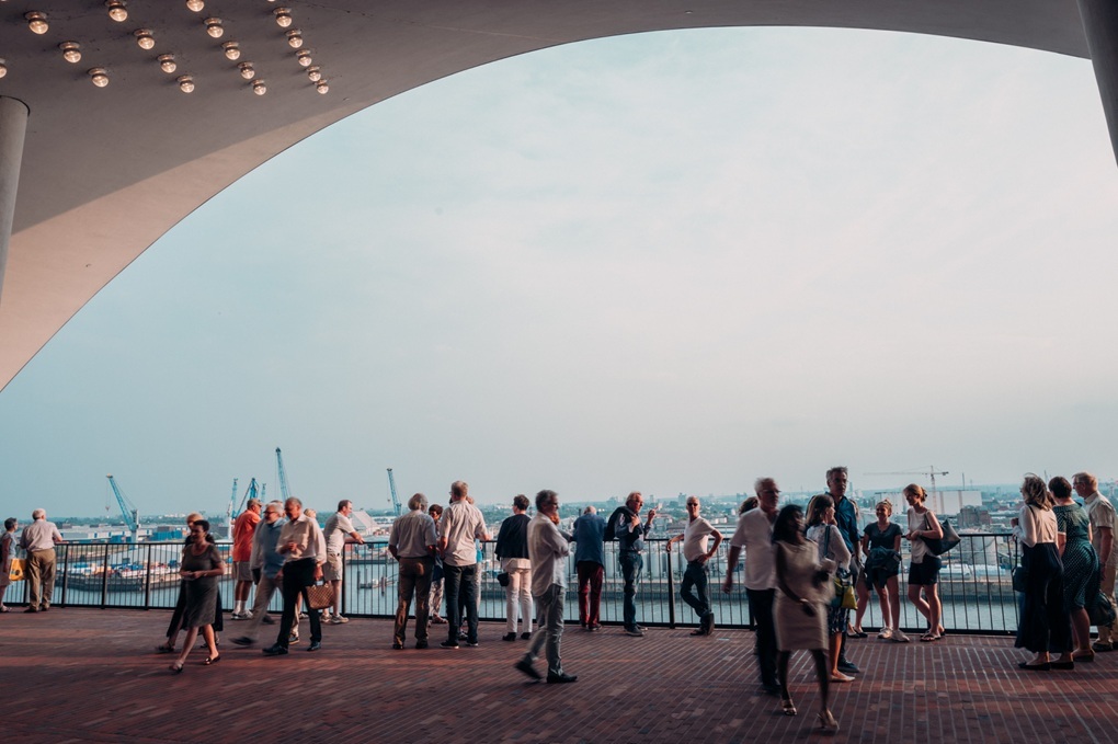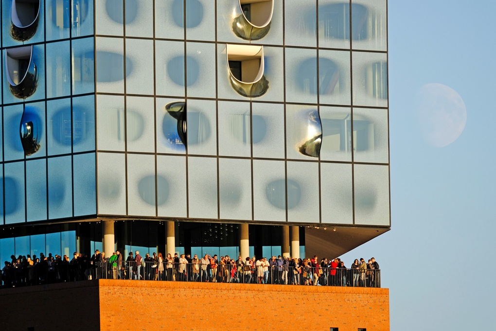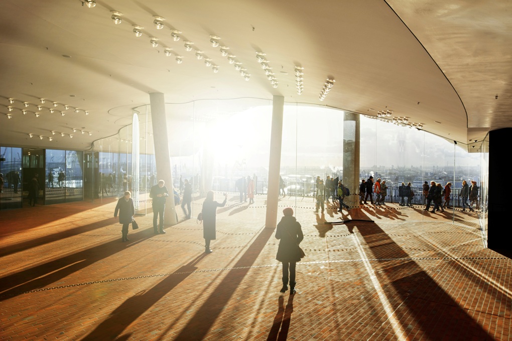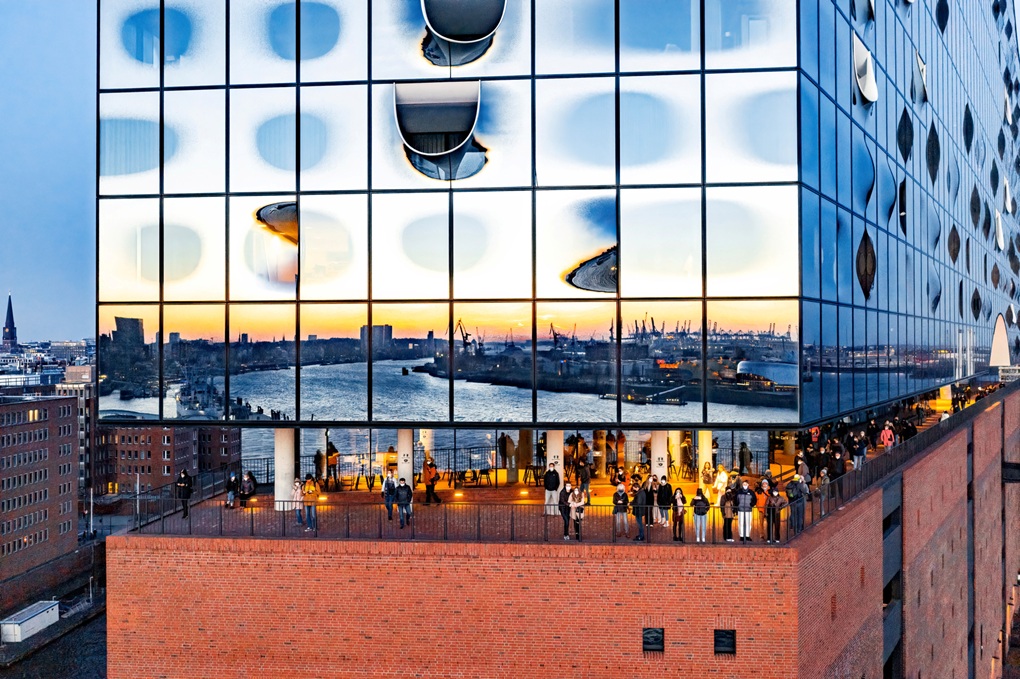 Zanimanje za arhitekturu glasovite hamburške koncertne dvorane Elbphilharmonie i dalje je vrlo visoko, a na vidikovcu Plaza Elbphilharmonie zabilježen je 25-milijunti posjetitelj. Svakodnevno do 17 000 ljudi dolazi u HafenCity kako bi s 37 metara visine uživali u pogledu na Hamburg i njegovu luku. Smješten između zidane baze i staklene nadogradnje, vidikovac omogućuje potpunu šetnju oko zgrade koncertne dvorane, a posjetitelji do njega stižu „najdužim zakrivljenim pokretnim stepenicama u zapadnoj Europi” – dugim čak 82 metara. Tzv. „Tube“ prolazi kroz povijesno skladište Kaispeicher do panoramskog prozora na šestom katu, odakle se kratkim pokretnim stepenicama dolazi na Plazu na osmom katu.