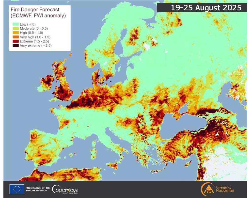 Prognoza opasnosti od požara do 25. kolovoza (Copernicus / EFFIS) i dalje pokazuje vrlo visoku i ekstremnu opasnost u mnogim dijelovima južne, zapadne i srednje Europe.