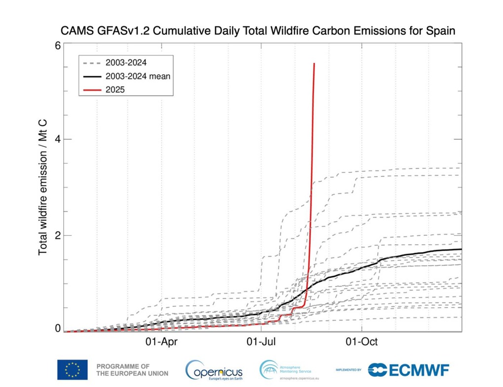 Do 20. kolovoza 2025. šumski požari u Španjolskoj ispustili su 22 milijuna tona CO₂, što daleko premašuje prosjek za razdoblje 2003.–2024. i predstavlja dosad najviše zabilježene emisije povezane s požarima u toj zemlji.