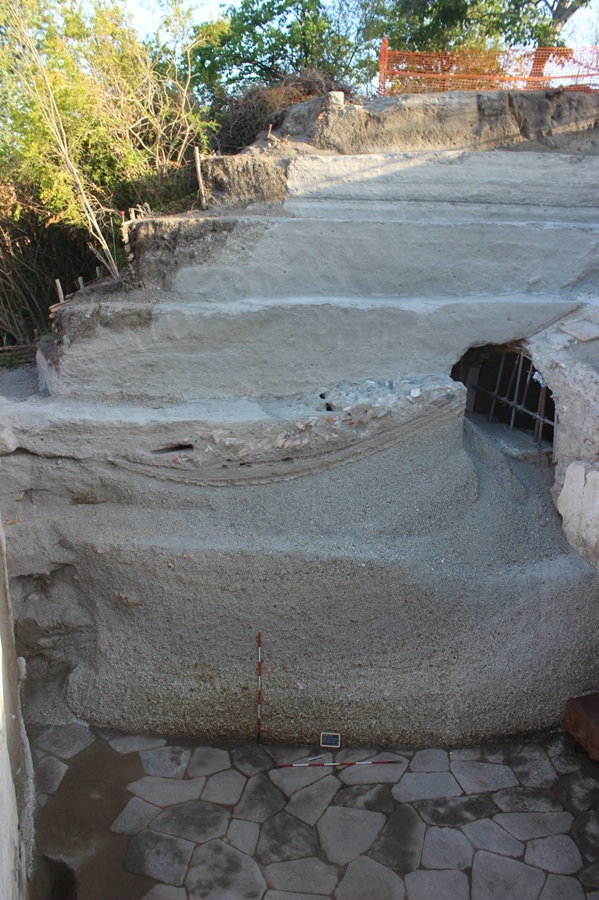 Iskopavanjem je također dokumentirana stratigrafska sekvenca erupcije Vezuva iz 79. godine, s razinama lapilija i piroklastičnih tokova koji su zapečatili prostore vile. Ispod sloja lapilija otkriven je i dio paleotla obrađenog tehnikom „a conchette“, koji svjedoči o upravljanju agrarnim krajolikom u antičko doba.