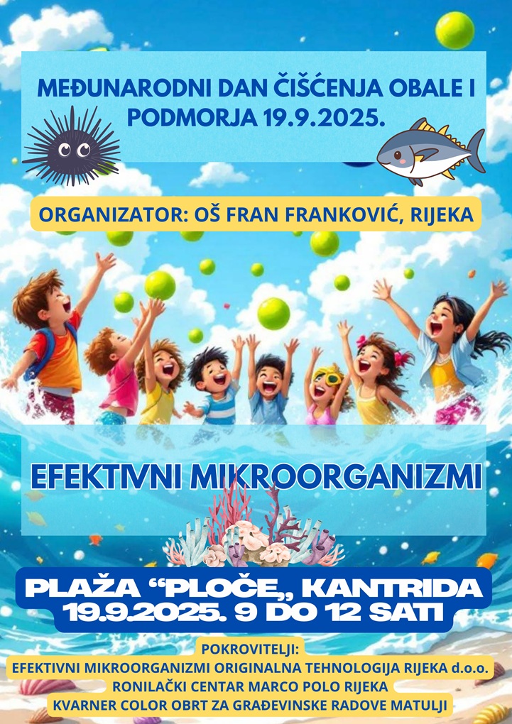 U 10:00 sati u more će biti spušteno 500 EM kugli s probioticima koje su, u suradnji s tvrtkom Efektivni Mikroorganizmi originalna tehnologija Rijeka d.o.o., izradili učenici posebnog razrednog odijela, prvih, četvrtih i sedmih razreda kao i učitelji OŠ Fran Franković.