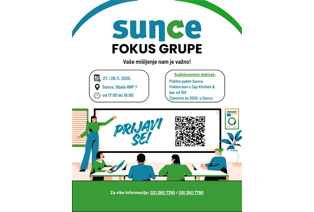 Udruga za prirodu, okoliš i održivi razvoj Sunce poziva građane Grada Splita i okolice na sudjelovanje u fokus grupama na temu „Zaštita okoliša i percepcija udruge Sunce“. Cilj je bolje razumjeti stavove javnosti o pitanjima zaštite okoliša, održivog razvoja te o radu i ulozi udruge Sunce u zajednici.