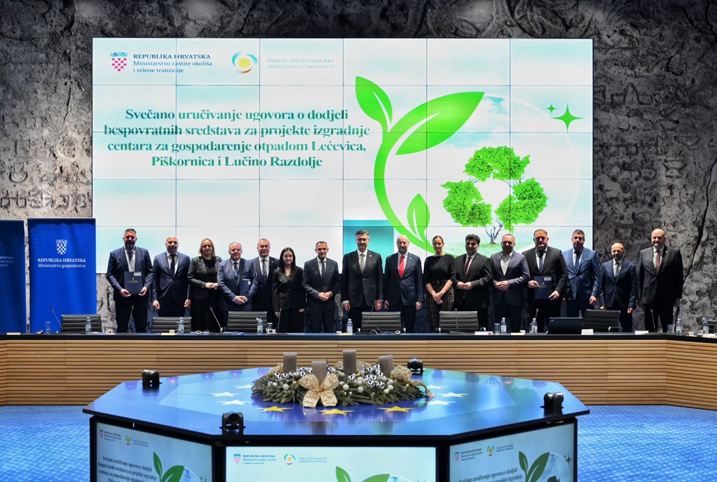 Uz predsjednika Vlade Republike Hrvatske Andreja Plenkovića, ministrica zaštite okoliša i zelene tranzicije Marija Vučković i direktor Fonda za zaštitu okoliša i energetsku učinkovitost Luka Balen uručili su 186 milijuna eura vrijedne ugovore za izgradnju triju centara za gospodarenje otpadom - Lećevica, Piškornica i Lučino razdolje. Od ukupnog iznosa 161 milijun eura odnosi se na bespovratna sredstva.