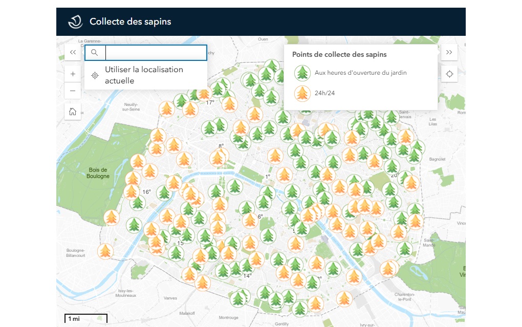 Na svojim mrežnim stranicama Grad Pariz ponovno je objavio interaktivnu kartu na kojoj su označene sve lokacije za odlaganje jelki i to u svakom pojedinom pariškom arondismanu, najčešće u parkovima i na zelenim površinama. Na karti je moguće odabrati najbližu lokaciju i dobiti sve praktične informacije, uključujući radno vrijeme za odlaganje jelki. Na taj način svim građanima omogućuje se jednostavno i uredno odlaganje jelki u blizini njihovog mjesta stanovanja i to do 20. siječnja 2026.