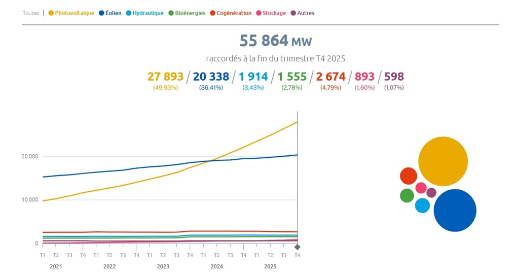 Operator distribucijske mreže Enedis objavio je godišnji pregled priključaka fotonaponskih sustava za 2025. godinu. Riječ je o 5,77 GW novih fotonaponskih kapaciteta, što je osjetno više nego 2024. godine (4,7 GW). Kada se uključe i podaci operatora prijenosne mreže RTE (Réseau de Transport d'Électricité), koji navodi 94 MW novopriključenih fotonaponskih kapaciteta na svojoj mreži (solarne elektrane veće od 12 MWp), Francuska je tako 2025. godinu zaključila s novim povijesnim rekordom – gotovo 5,9 GW novih fotonaponskih priključaka.