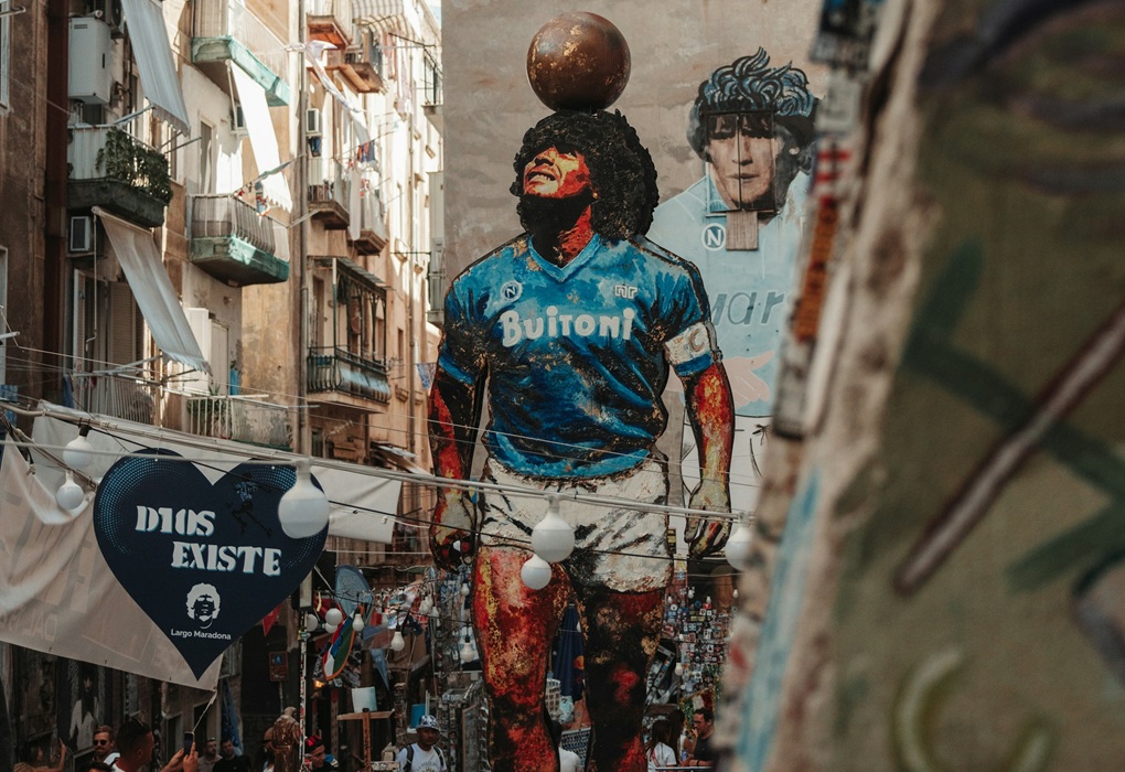 Najpoznatiji napuljski mural nastao je 1990. godine, kada je nogometni klub S.S.C. Napoli osvojio svoj drugi Scudetto. Izradio ga je tada 23-godišnji Mario Filardi, mladi umjetnik koji je u to vrijeme živio u ovom dijelu Napulja. Zahvaljujući pomoći navijača iz susjedstva, Filardi je Maradonin mural dovršio u samo dvije noći i tri dana. Nakon završetka murala, organizirana je velika proslava s neizbježnim vatrometom. S vremenom je mural počeo blijedjeti pa je lokalni obrtnik, Salvatore Iodice, 2016. godine preuzeo zadatak njegove restauracije. Dodatna obnova završena je u listopadu 2017., kada je poznati argentinski street art umjetnik Francisco Bosoletti restaurirao Maradonino lice na muralu.