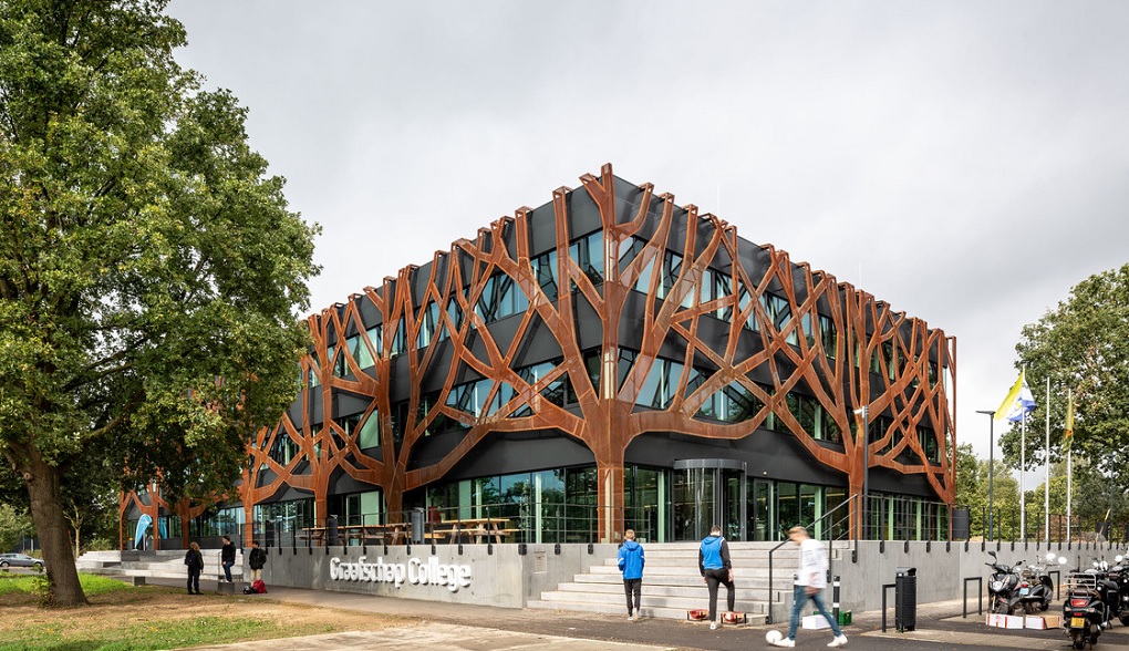 Nizozemski arhitektonski studio Cepezed iz Delfta nedavno je završio novu zgradu za Graafschap College u Doetinchemu, koja za razliku od većine školskih objekata u Nizozemskoj ne koristi prirodni plin, već se u potpunosti napaja električnom energijom. Izgrađena za potrebe 700 studenata Odjela za sport, vježbe i sigurnost, nova školska zgrada stavlja naglasak na poticajno i zdravo radno okruženje te interijere koji u znatnoj mjeri koriste prirodno dnevno svjetlo. Kako bi se zgrada što više uklopila u okoliš i povezala s hrastovim stablima u neposrednom okruženju, arhitekti su zgradu djelomično prekrili strukturom u obliku hrastova, izrađenom od corten čelika.
