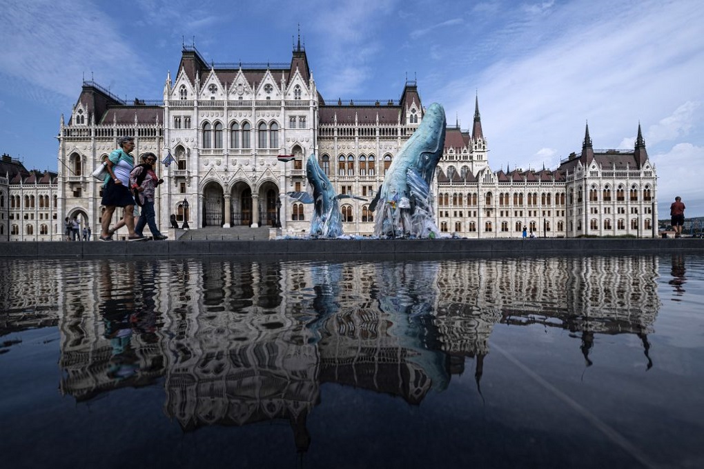 - Greenpeaceova skulptura kitova je nakon Umaga, Poreča i Pule ovog tjedna izložena ispred Mađarskog parlamenta u Budimpešti / Foto: MTI