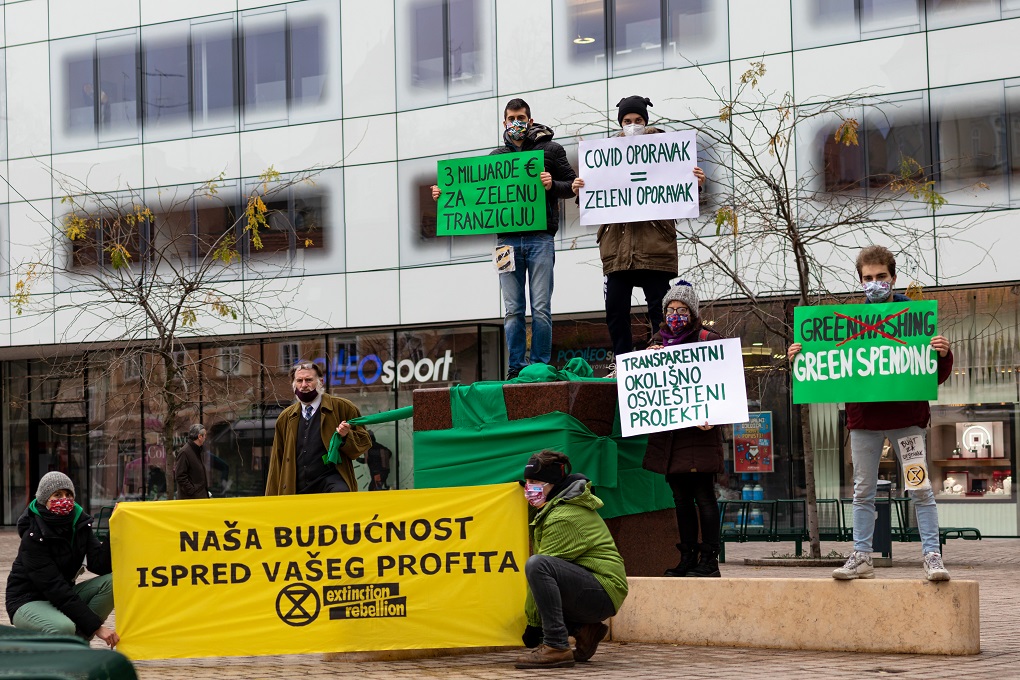 Extinction Rebellion je današnjim performansom na zagrebačkom Europskom trgu poručio Vladi RH da će pažljivo pratiti na što se troši oko šest milijardi eura raspoloživih bespovratnih sredstava i tri milijarde eura zajmova EU-a namijenjenih za tzv. zeleni oporavak od pandemije COVID-19 te da neće tolerirati financiranje neodrživih i kratkoročno profitabilnih projekata kojima se pogoduje privatnim investitorima, a šteti okolišu i društvu.