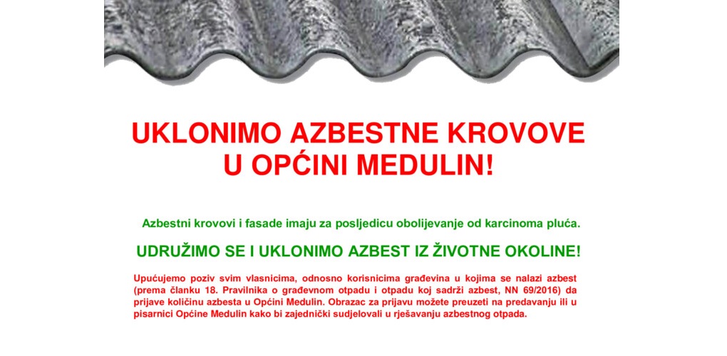 Pozivaju se svi mještani, vlasnici i korisnici građevina na i u kojima se nalazi azbest da se pridruže predavanju „Uklonimo azbestne krovove u općini Medulin!”. Predavanje se održava u sklopu projekta zamjene azbestnih krovova i fasada koji provodi udruga Moj otok u suradnji s Općinom Medulin.