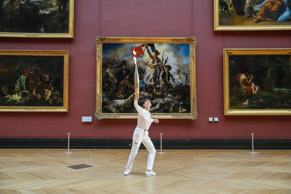 - Francuska plesačica i koreografkinja Marie-Claude Pietragalla i olimpijski plamen u Muzeju Louvre ispred remek-djela francuskog slikara Eugenea Delacroixa „Sloboda vodi narod“ („La Liberté guidant le peuple“) © Paris 2024 | Guillaume Ruchaud | SIPA PRESS