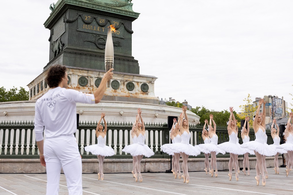 - Baletan Hugo Marchand, zvijezda Opéra national de Paris s olimpijskim plamenom ispod monumentalnog Srpanjskog stupa (Colonne de Juillet), podignutog u spomen na Revoluciju 1830. i balerine Pariške opere koje su ga dočekale plešući odlomak iz „Labuđeg jezera“ © Ville de Paris