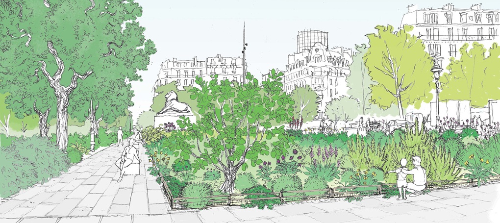 Na trgu Place Denfert-Rochereau, koji će po završetku obnove imati ukupno 10 000 m² propusnih površina, planirana je sadnja 107 stabala i 30 000 biljaka različitih vrsta te uređenje 4390 m² pješačkih površina. Uz obnovu svih stanica javnog gradskog prijevoza, trg će također dobiti 107 metara traka za autobusni promet, kao i 800 metara novih biciklističkih staza.