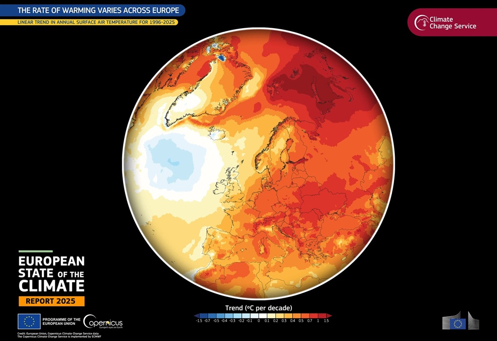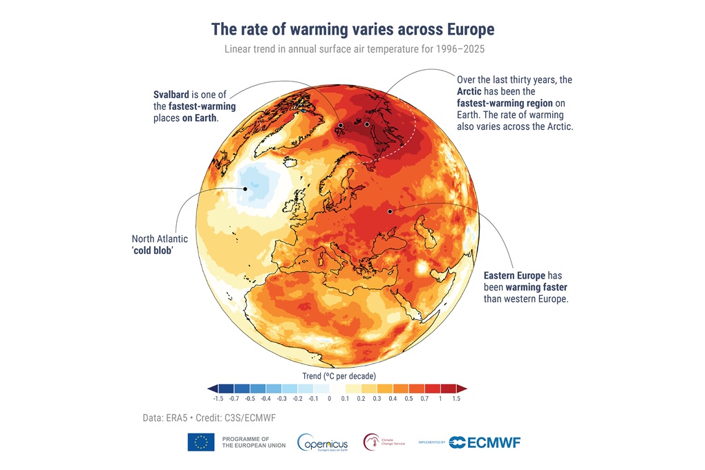 Brzo zagrijavanje u Europi smanjuje snježni i ledeni pokrivač, dok opasno visoke temperature zraka, suša, toplinski valovi i rekordne temperature oceana utječu na regije od Arktika do Mediterana. Europa je, zajedno s mnogim drugim dijelovima svijeta, izložena sve većim utjecajima klimatskih promjena – od rekordnih toplinskih valova na kopnu i moru, do razarajućih šumskih požara i kontinuiranog gubitka bioraznolikosti – s posljedicama za društva i ekosustave diljem Europe.